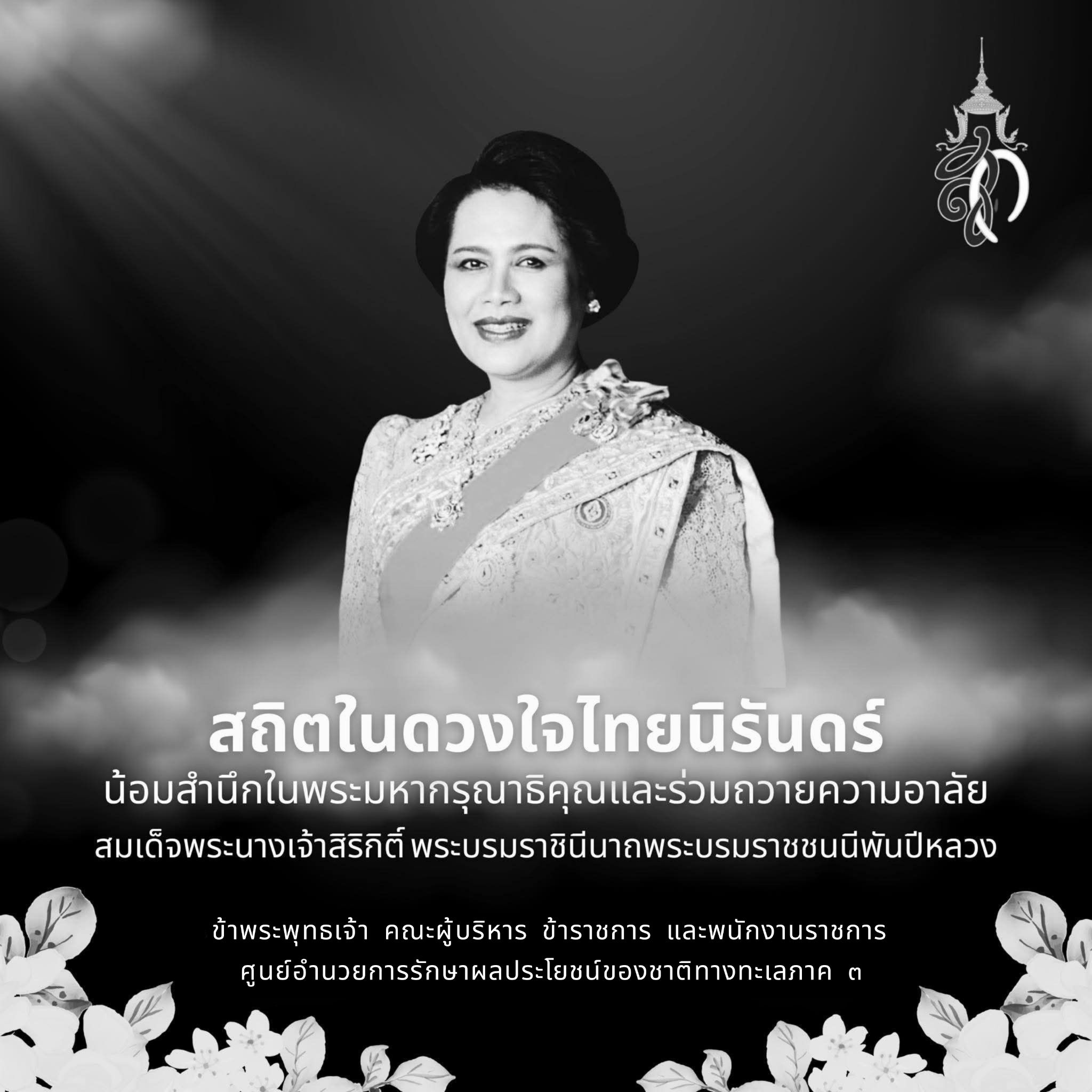 น้อมสำนึกในพระมหากรุณาธิคุณเป็นล้นพ้นอันหาที่สุดมิได้ สมเด็จพระนางเจ้าสิริกิติ์ พระบรมราชินีนาถ พระบรมราชชนนีพันปีหลวง ข้าพระพุทธเจ้า คณะผู้บริหาร ข้าราชการ และพนักงานราชการ ศูนย์อำนวยการรักษาผลประโยชน์ของชาติทางทะเลภาค ๓